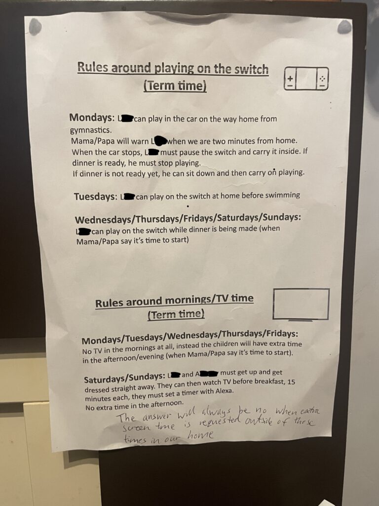 We started off with vague rules around what happened on certain days of the week in relation to the switch/screen time. This was then edited to specify rules around term-time vs non term-time, after a meltdown when we went from holidays back to school. I had to add an addendum to specify any requests for extra screen time will always be a no.