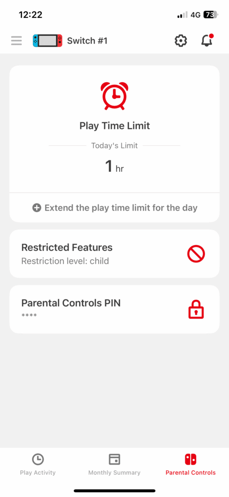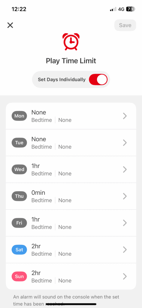 There’s a Nintendo Switch Parental Control app and once set up, you can set time limits for individual days of the week, as well as a bedtime and control it all from your phone/device. We have it set to a maximum of 1 hour on weekdays and 2 hours at weekends. When time to turn off is approaching, the switch will notify the player and a small countdown timer will appear. It’s up to the player to ensure they’ve finished doing everything they want to do, because when the time is up, that’s it. The app will shut down and they cannot play even a second longer.