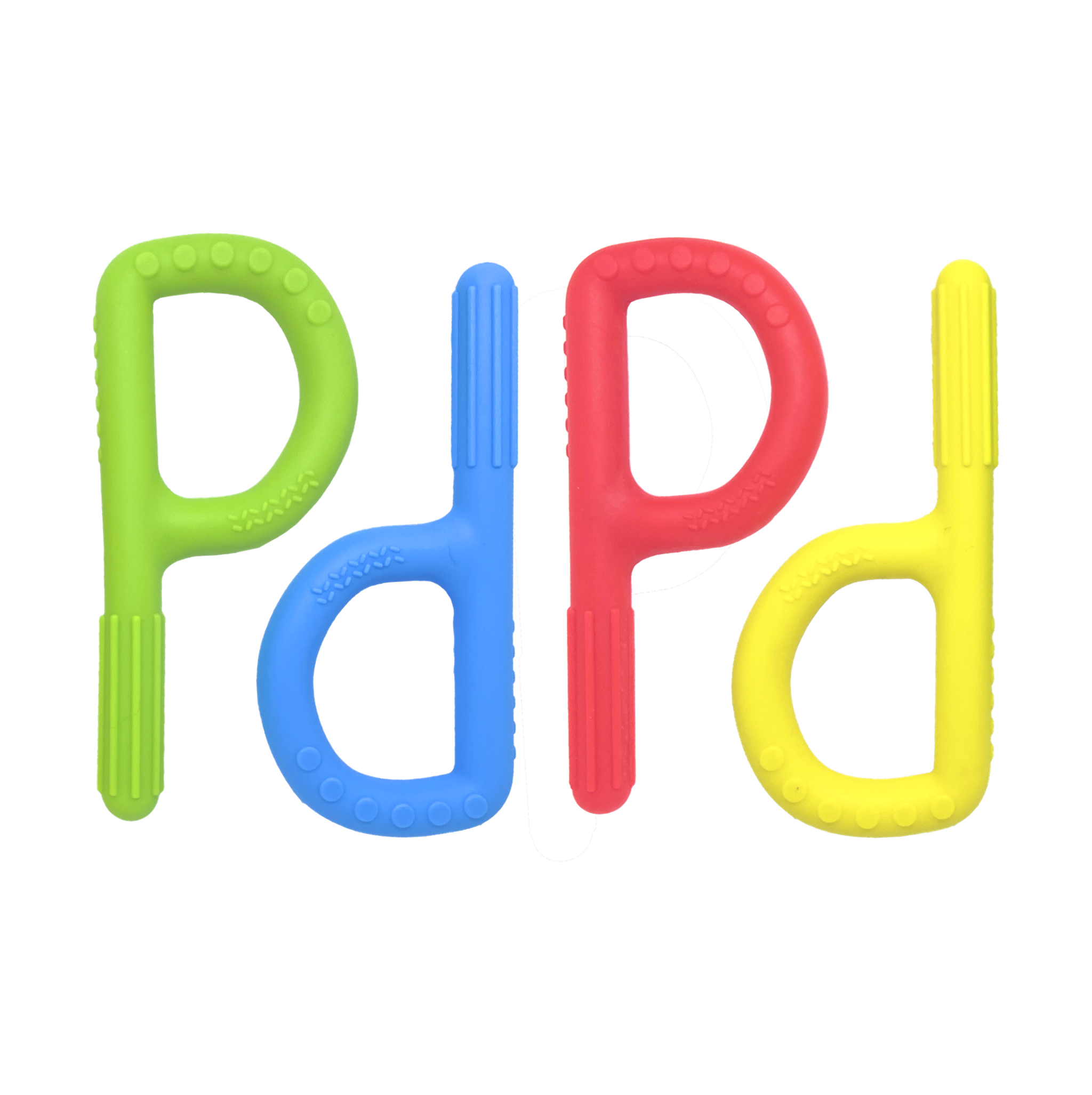 Made from medium-firm, flexible, food-grade silicone, these fun chews come in bright, bold colours — blue, green, red, and yellow — and are perfectly shaped for chewing from any angle.
