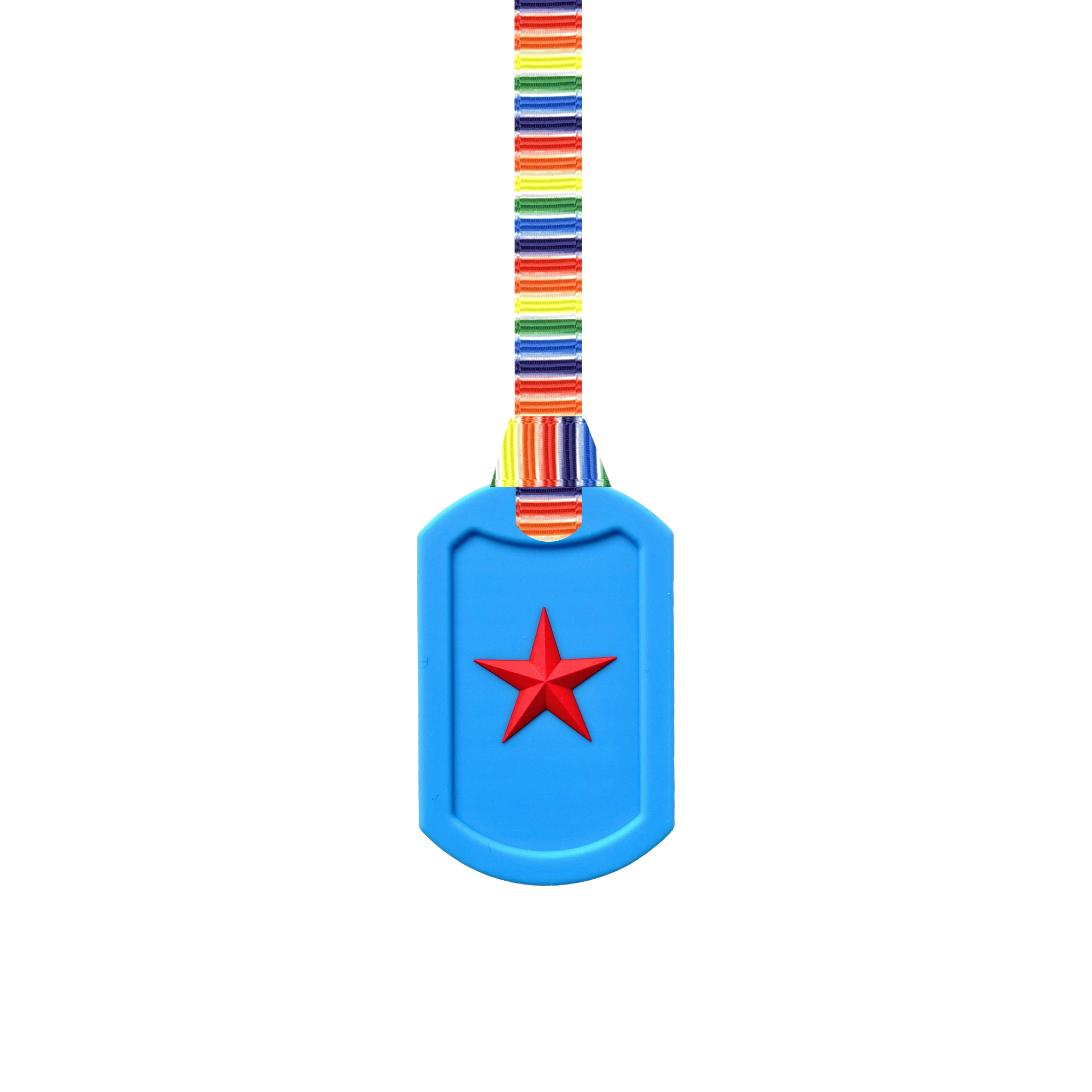 Blue Star Tag Chew Necklace with retro stripes lanyard